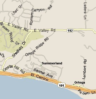 From Santa Barbara (~5 miles): south on 101, exit at Sheffield Drive. Turn right onto Sheffield Drive. Take Sheffield Drive 1.3mi to East Valley Road. Turn right on East Valley Road and go 1.3 mi--turn left on Ladera Lane (look closely for the Ladera Lane turn).